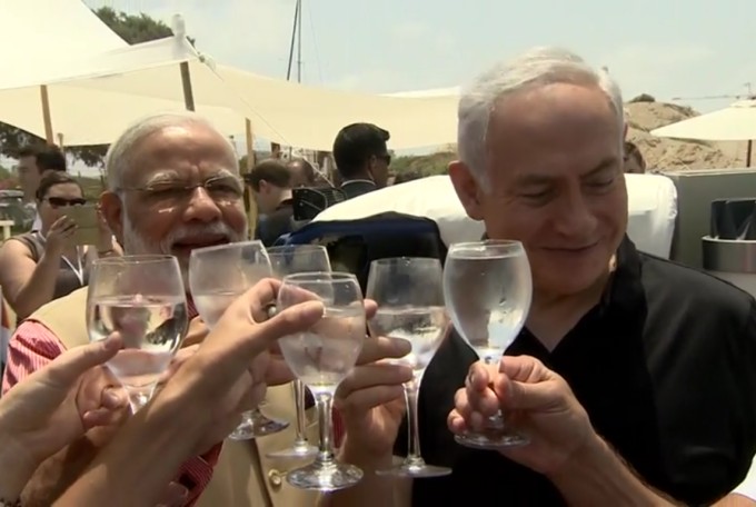 ראש הממשלה בנימין נתניהו ומקבילו ההודי נרנדרה מודי הגיעו לחוף גבעת אולגה לביקור במתקן להתפלת מים והשניים ניצלו את ההזמדנות כדי להצטנן וטבלו את רגליהם במי הים